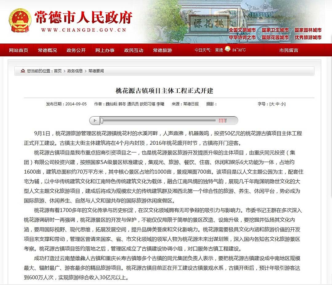 常德市人民政府網》桃花源古鎮項目主體工程正式開建